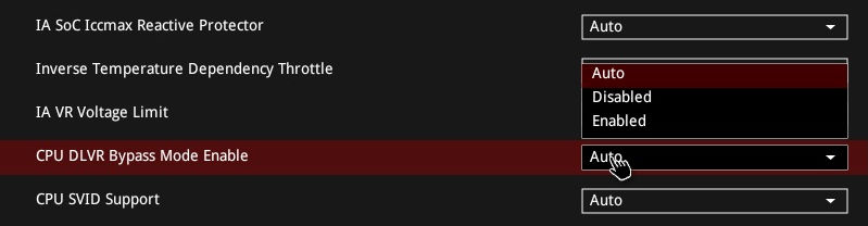 Intel第13世代Core CPUはすでにリリースされていますが、新しいZ790マザーボードでさえ、DLVRの兆候は見られませんでした。Intelからはこの機能についての言及はありませんでしたが、ASUSはBIOSにDLVRの痕跡を残していたようです。CPU DLVR Bypass Mode Enable」という機能は、Raptor LakeやAlder LakeのCPUをサポートする新しいファームウェアで確認することができます。残念ながら、利用可能な3つのオプションのいずれも、電力効率に違いはないようだった。