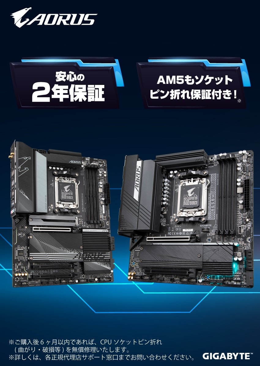 GIGABYTE が業界で最初に (Intel 系で2016年2月) 導入し、Intel 系マザーボード製品では既に業界スタンダードであるピン折れ保証を、AMD AM5 系にも適応いたします。