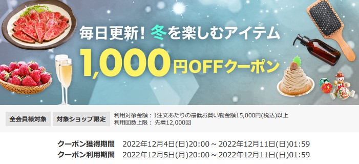 【楽天スーパーSALE】冬を楽しむアイテム 1,000円OFFクーポン(2022/12/5~12/11)
