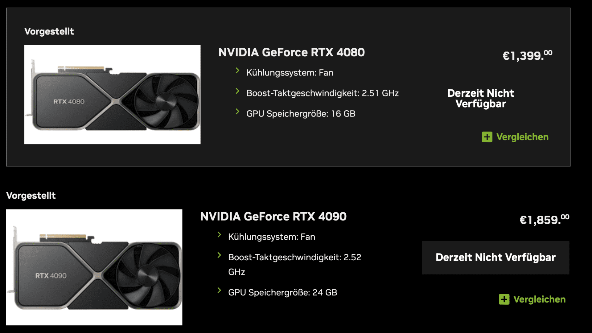 NVIDIA GeForce RTX 4090が1,949ユーロから1,859ユーロに、GeForce RTX 4080が1,469ユーロから1,399ユーロに値下がりしています。これらは、NVIDIAの公式ストアによると、欧州におけるRTX 40 GPUの新価格だ。