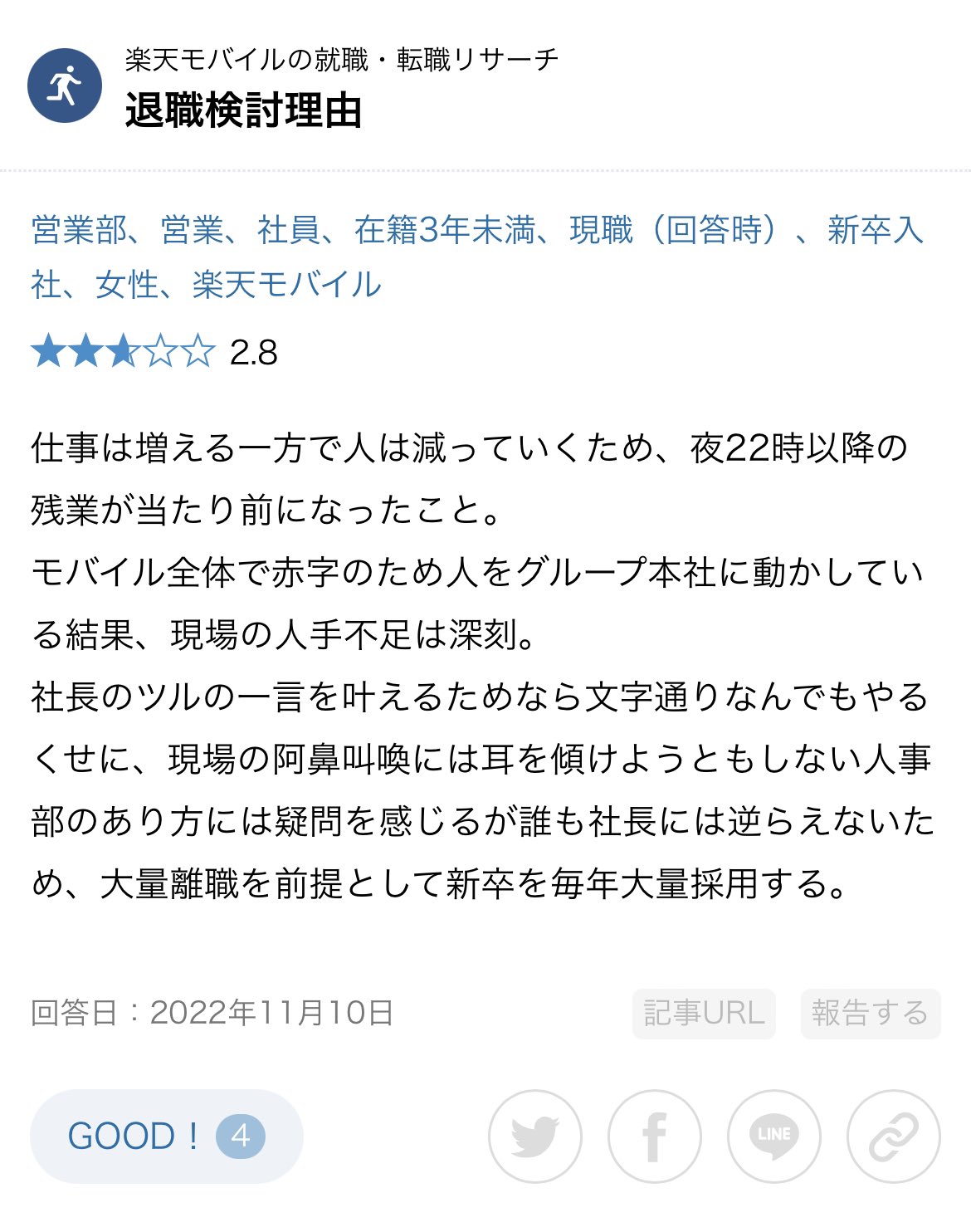 楽天モバイル社員の退職検討理由ヤバすぎでしょwwwww スポンサーリンク 2023/01/23 04:27 PC・IT 楽天モバイル社員の退職検討理由ヤバすぎでしょwwwww 1: 名無し 2023/01/20(金) 21:02:03.49 ID:wbA5rylB0 BE:271912485-2BP(1500) こんな会社に未来はあるの…?三木谷さぁ… 続きを読む