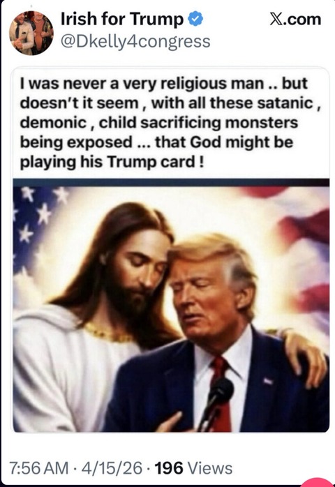 1 名前:少考さん ★:2026/04/16(木) 07:29:35.24 ID:rszCV8ru9.net 今度はキリストと並ぶ画像 トランプ氏「とても良い」 | NEWSjp -共同通信 Published 2026/04/16 06:33:50 【ワシントン共同】トランプ米大統領は15日、イエス・キリストと見られる人物と寄り添う画像を交流サイト(SNS)に投稿し「過激な左派は気に入らないかもしれないが、私はとても良いと思う」と書き込んだ。 (中略) トランプ氏が新たに載せた画像は、他人のX(旧ツイッター)の投稿を引用したもの。マイクの前に立つトランプ氏をキリストが斜め後方から抱き、目をつぶって額を合わせる様子で、背景には星条旗が描かれている。 トランプ氏は最近、イラン攻撃に批判的なローマ教皇レオ14世と対立した。 ※全文はソースで https://news.jp/i/1417262334263672855 ※画像 ※関連スレ トランプ氏、キリスト姿の画像を投稿 保守派から批判相次ぎ削除 ★2 [少考さん★] https://asahi.5ch.io/test/read.cgi/newsplus/1776142868/ トランプ大統領、ローマ教皇に謝罪拒否 「彼が間違っている」発言で対立激化 ★2 [ぐれ★] https://asahi.5ch.io/test/read.cgi/newsplus/1776152162/