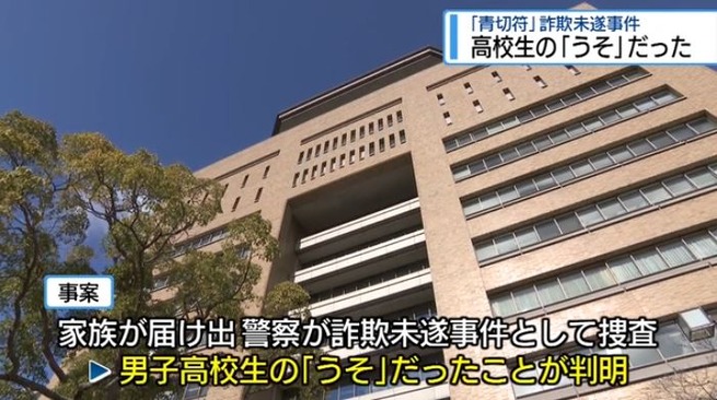 「青切符」詐欺未遂事件 高校生の「うそ」だった【徳島】4月10日、県内の高校生が自転車交通違反の「青切符」をかたる詐欺未遂にあったとして、警察が捜査していた事案で、警察は16日、事案は高校生による嘘だったと明らかにしました。 4月10日、徳島市の市道で自転車に乗っていた男子高校生が見知らぬ男に呼び止められ、 「警察です。一時停止と無灯火で1万5000円を払ってください」と、交通違反の反則金として金銭を要求された旨、家族に対し訴えました。 訴えを聞いた家族が詐欺ではないかと疑い、警察に届け出たため、警察は詐欺未遂事件として捜査していましたが、 これは男子高校生による「小遣い欲しさの嘘」だったことが15日、分かりました。 男子高校生は「反則金を払う必要がある」などと家族に訴え、家族から金をもらって小遣いにしようとしていたとみられます。 男子高校生に、警察を騙す意図はなかったということです。 https://news.yahoo.co.jp/articles/fcc0a36d1b3a111dc9913aec7199dd7fa938470f