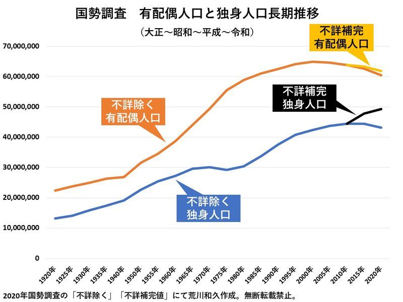 有配偶の方が若干多いものとなっていたが、不詳補完値ベースでいけば、それより先に「独身の方が多い国・ニッポン」が完成してしまうかもしれない。