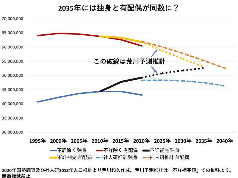 これによれば、15年後の2035年には、有配偶人口と独身人口は約5300万人あたりで同数に並ぶことになる。
