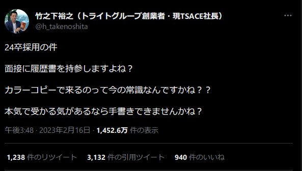 大企業の創業者、カラーコピーの履歴書に苦言「本気で受かる気があるなら手書きできませかね?」