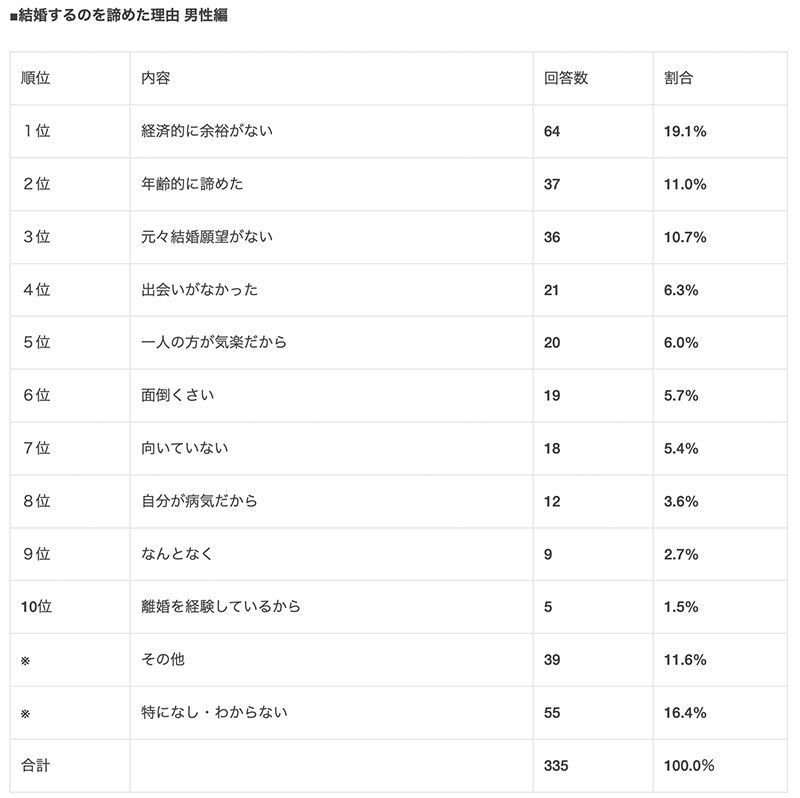 結婚を諦めた理由の男性1位は「経済的に余裕がない」