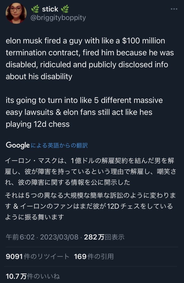 【悲報】イーロンマスク、障害持ちの従業員を障害を理由に解雇した上障害をバカにして大炎上 スポンサーリンク 2023/03/09 15:30 PC・IT 【悲報】イーロンマスク、障害持ちの従業員を障害を理由に解雇した上障害をバカにして大炎上 1: 名無し 2023/03/09(木) 09:24:29.54 ID:BdYbuBhud おまけにその社員が一億ドルの解雇契約を持っていたことが判明し謝罪に追い込まれる 続きを読む