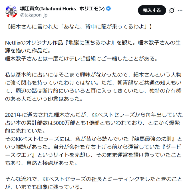 ホリエモン「昔、細木数子さんに『背中に龍が乗ってる。ライブドアは大企業になる』と言われた」