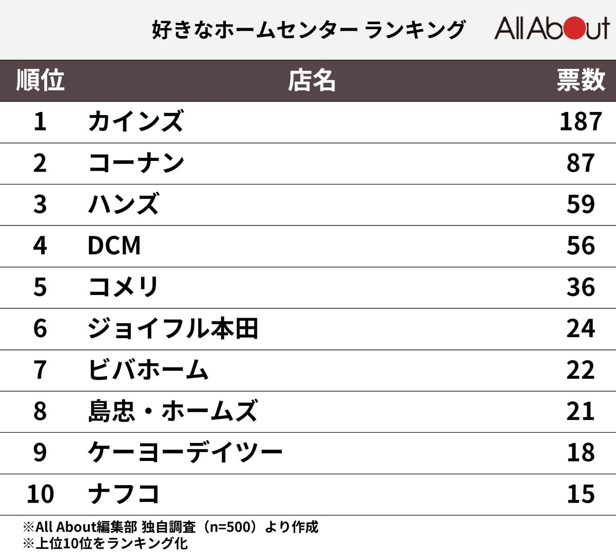 All About編集部は12月5~11日の期間、全国500人を対象に「ホームセンター」に関するアンケート調査を実施。今回はその中から、「好きなホームセンター」ランキングの結果を紹介します。