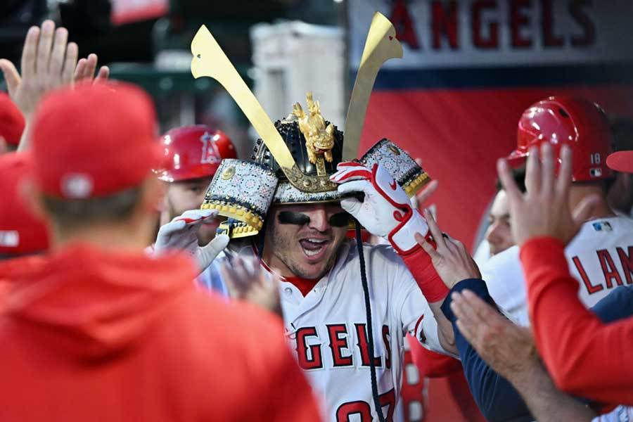 仲間から黄金色に輝く兜を被せられた。エンゼルスでは昨季、本塁打を打った選手が