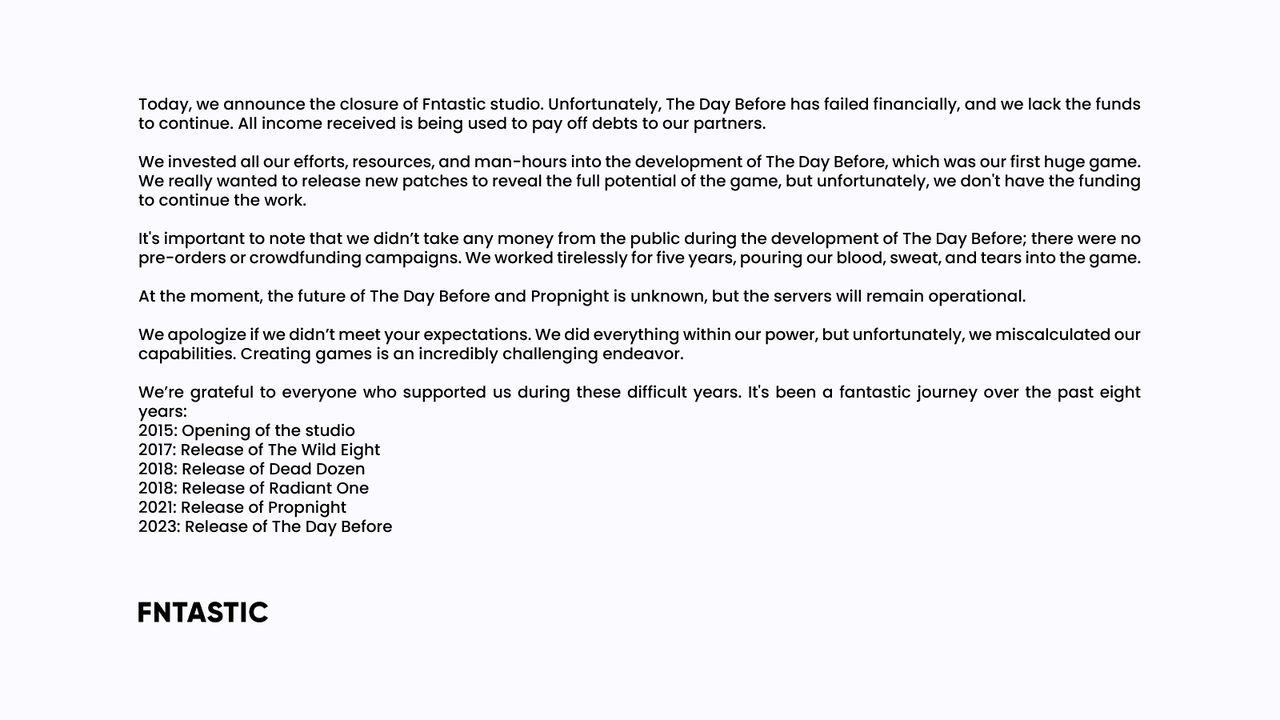 「The Day Before」のスタジオ「Fntastic」が閉鎖 資金難で今後のゲーム開発が困難。サーバーは引き続き稼働予定 – GAME Watch 「The Day Before」のスタジオ「Fntastic」が閉鎖 資金難で今後のゲーム開発が困難。サーバーは引き続き稼働予定 GAME Watch (出典:GAME Watch) |