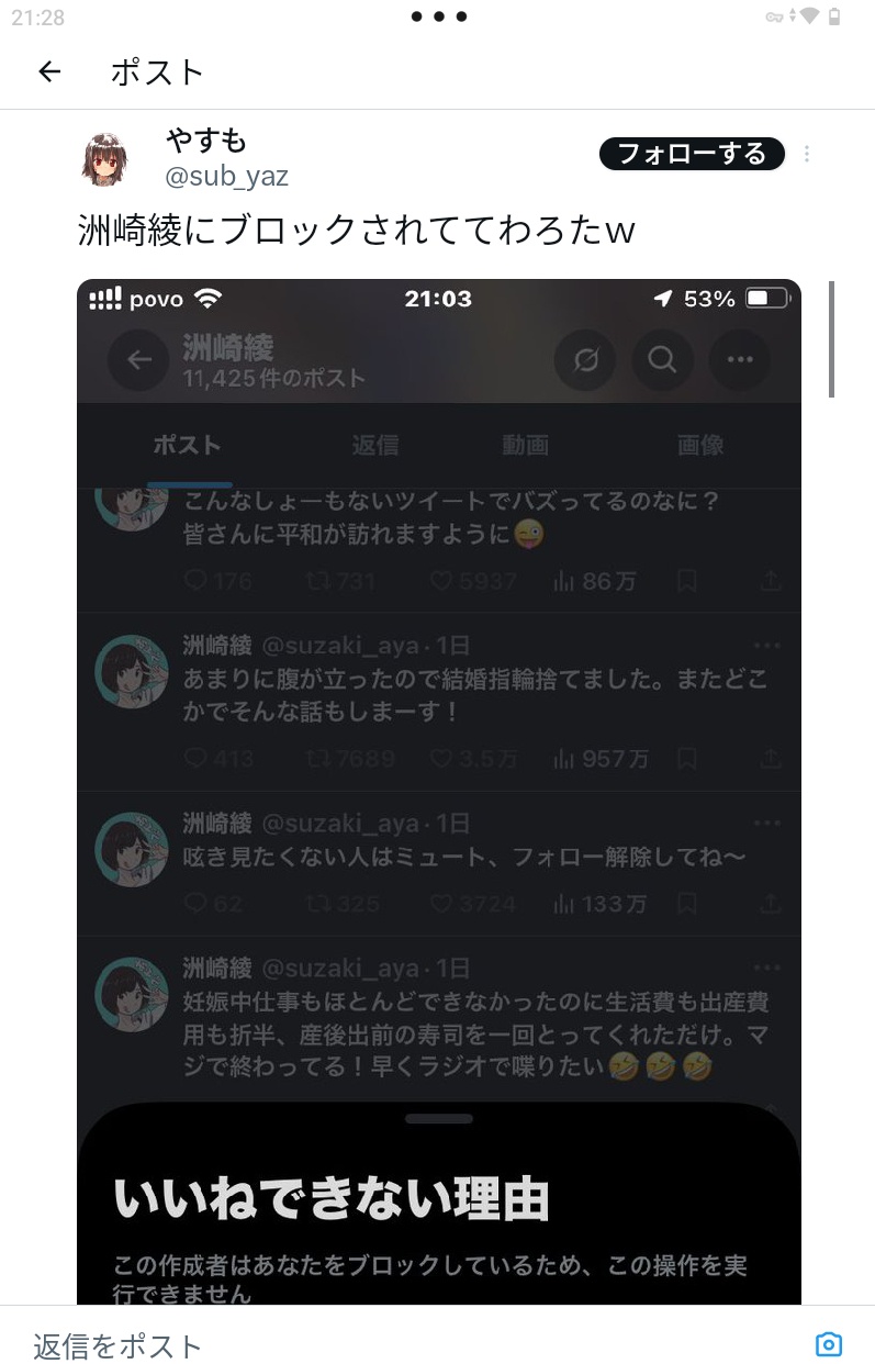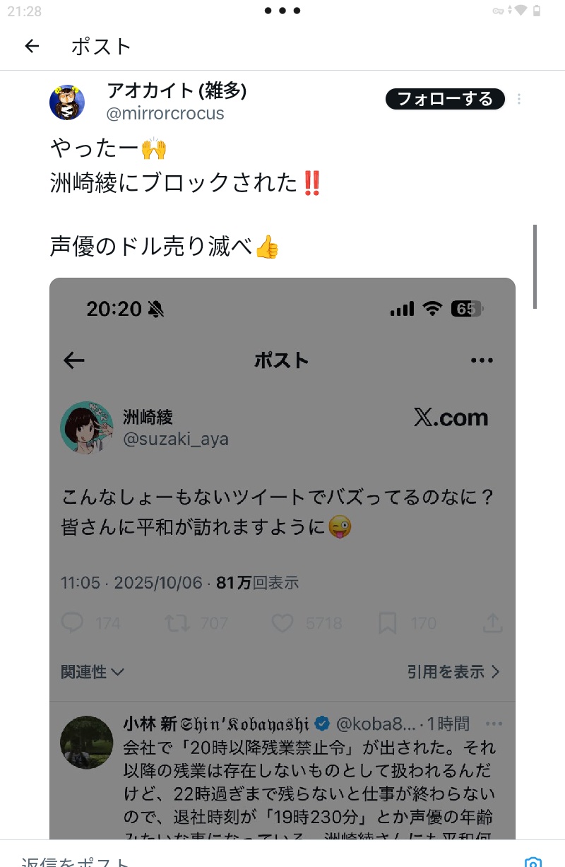 【悲報】人気声優の洲崎綾さん、怒涛のブロック開始