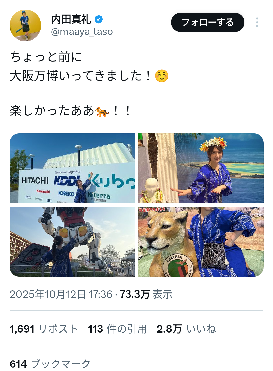 声優の内田真礼さん、駆け込み万博に訪問「楽しかったああ🐅!!」
